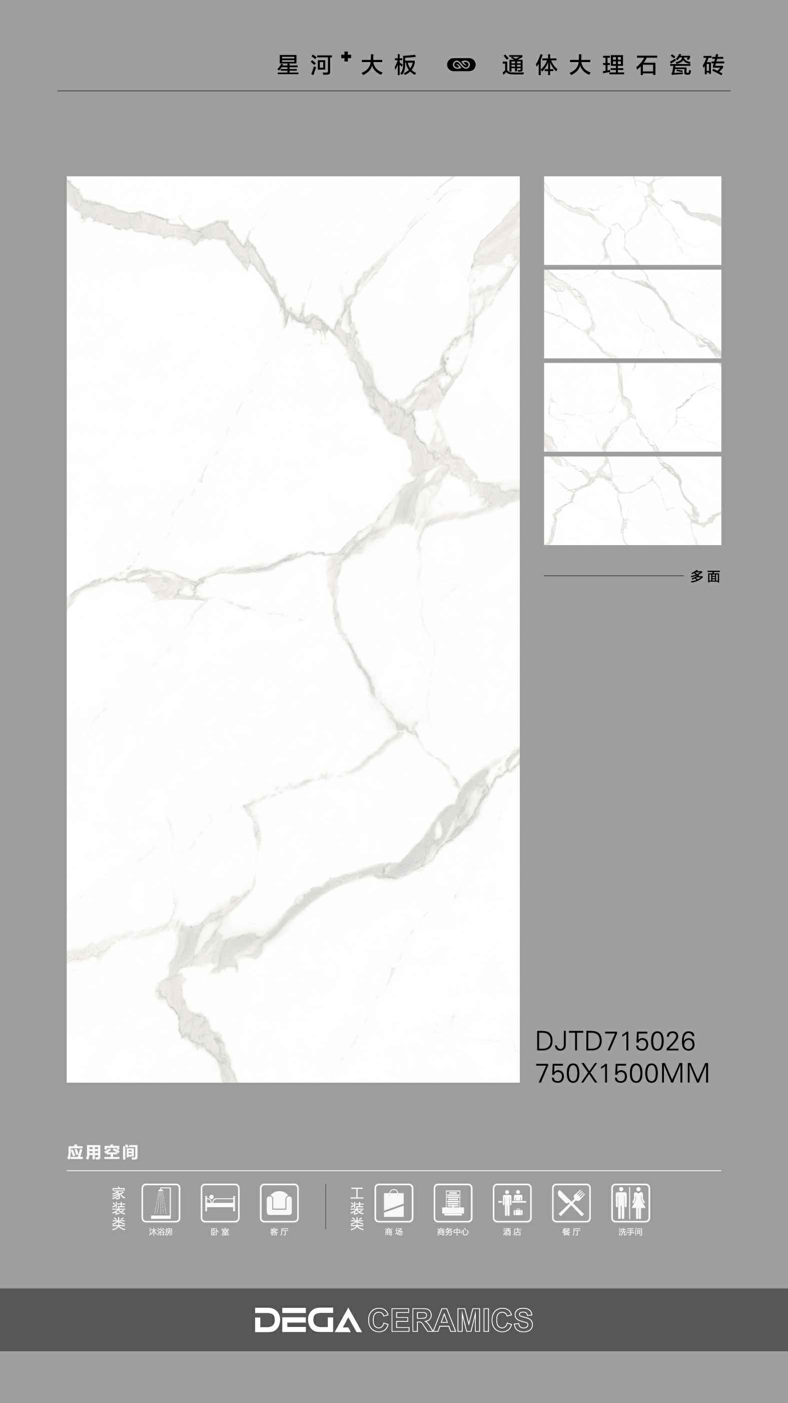 从规格形式的选择、纹理的趣味,到丰富内涵的表现、文化的传承等…… 都是她的每一侧面,在750X1500MM创造的舞台中央,是属于一片瓷砖传奇剧的演出。